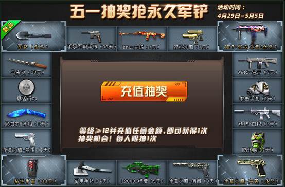 五一劳动迎军铲,全新近战武器伤害范围广,攻击灵活,商城和活动充值抽奖都可获得哦!