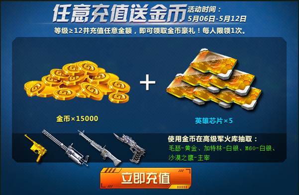 活动规则:充值任意金额,即可领取15000金币和5个英雄芯片,可在军火库中抽取黄金白银武器哦。