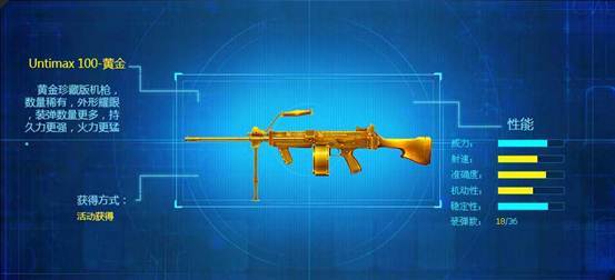 Untimax100-黄金:黄金珍藏版机枪,数量稀有,外形耀眼,装弹数量更多,持久力更强,火力更猛!