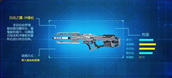自由之翼-冲锋枪:来自自由梦境,据说是羽翼所化,魔鬼般的威力,完美融合狙击和冲锋枪双重形态进行状态切换。