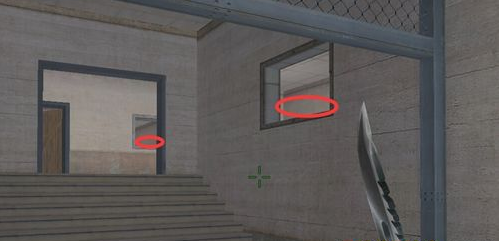 上图是我们进入B仓的位置,如果敌人同样是第一时间就冲向B的话,这里就是相遇的点,那么我们需要提防哪个就是途中标记的位置。